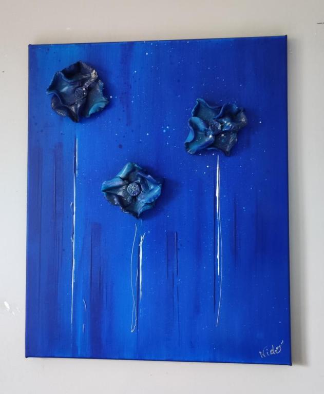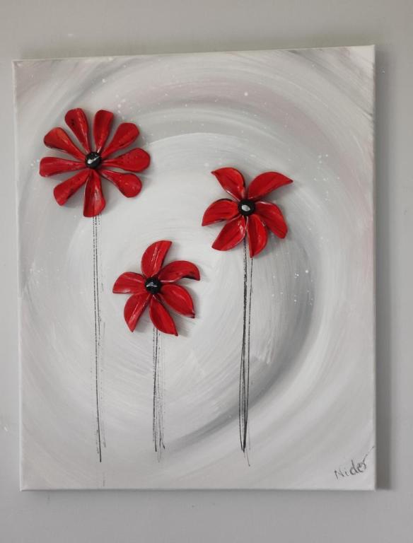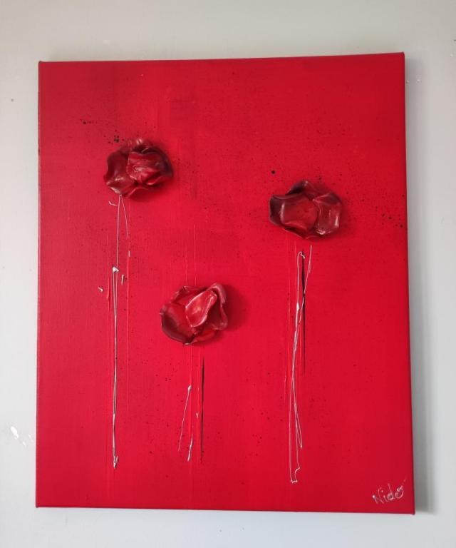 Tableau abstrait réalisé en argile les fleurs sont façonnées et insérées sur une toile coton et châssis en bois dimensions 38 x 46 un vernis protecteur est appliqué pour protéger l’oeuvre 65€ Coquelicots