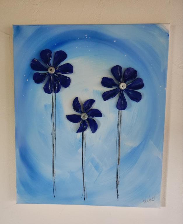 Tableau réalisé avec de l’argile les fleurs sont façonnées et insérées en 3D sur une toile coton et châssis en bois dimensions 38 x 46 Un vernis est appliqué pour protéger l oeuvre 65€ Pensées