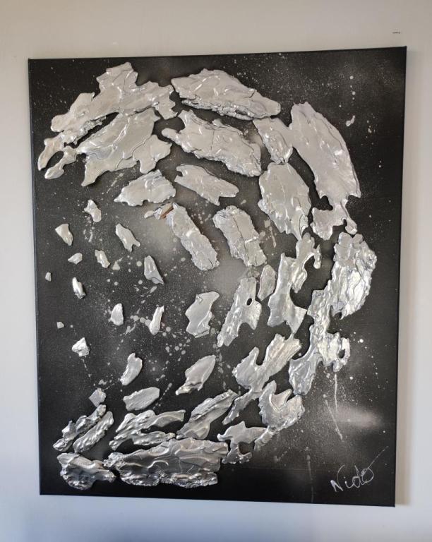 Tableau contemporain original réalisé avec des écorces peintes couleur chrome et insérées en 3D sur fond noir acrylique toile coton et châssis en bois dimensions 50 x 60 Un vernis est appliqué pour protéger l’oeuvre 130€